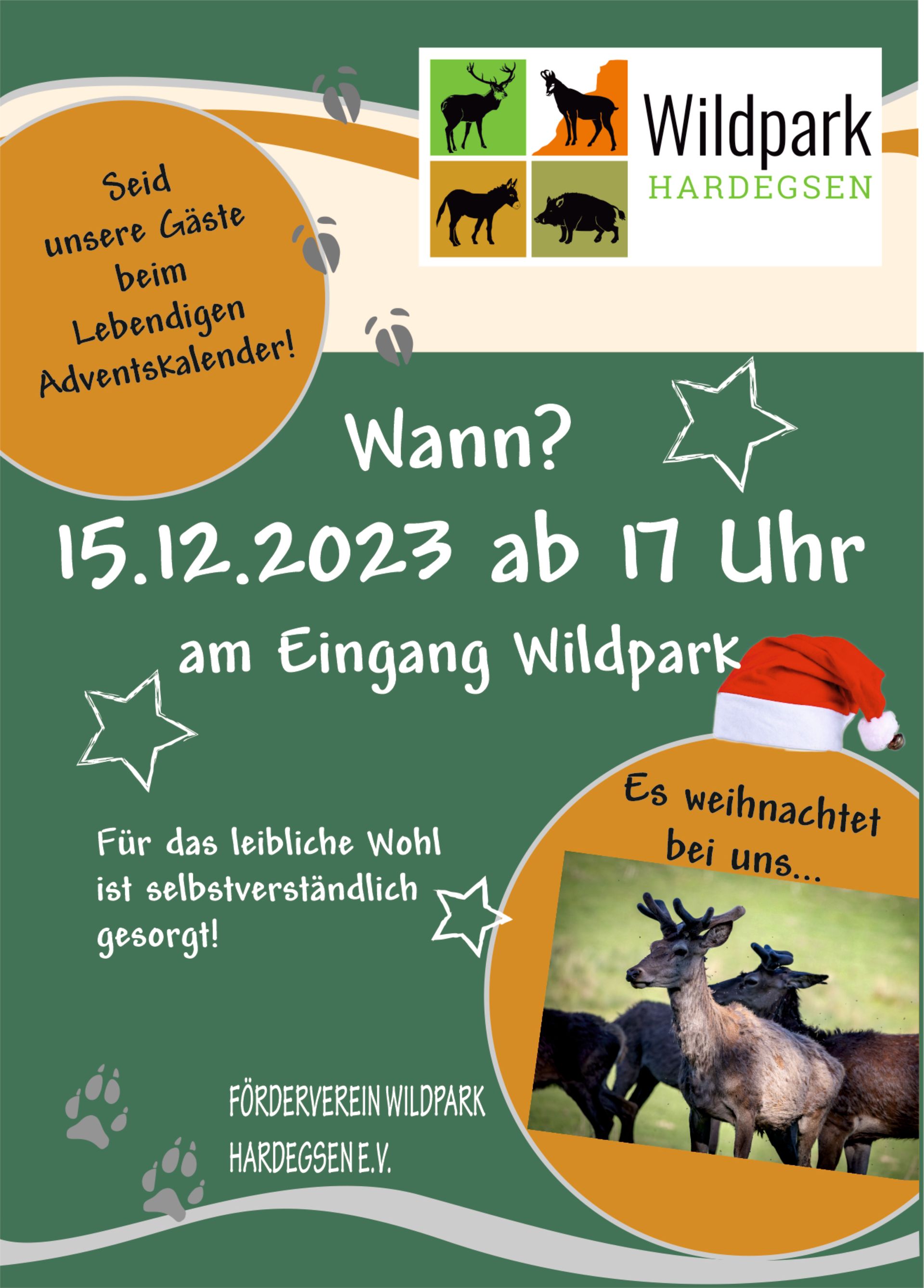 Der Förderverein Wildpark Hardegsen e.V. lädt, im Rahmen des lebendigen Adventskalenders der Gemeinschaft der Selbstständigen Hardegsen, am 15.12.23 ab 17 Uhr herzlich zu seinem "Türchen" am Eingangsgebäude des Wildparks ein. Für das leibliche Wohl ist selbstverständlich gesorgt. Es gibt Suppe, Glühwein und alkoholfreie Getränke.
